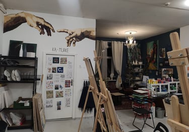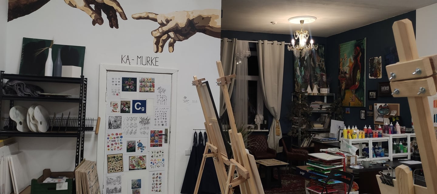 -Renkantis užsiėmimus su priemonėmis, į kainą įskaičiuoti prof. akriliniai dažai, teptukai, paletės, prijuostės ir t.t. Tapome ant popieriaus (drobę galima atsinešti savo arba įsigyti studijoje (3 - 15€).