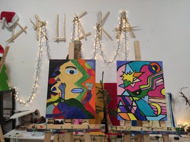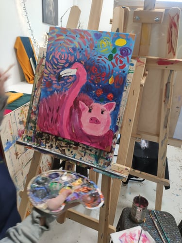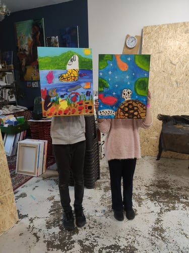 -Visos priemonės į kainą įskaičiuotos (prof. akriliniai dažai, teptukai, paletės, prijuostės ir t.t. Tapome ant popieriaus) (drobę galima atsinešti savo arba įsigyti studijoje (3-15€))