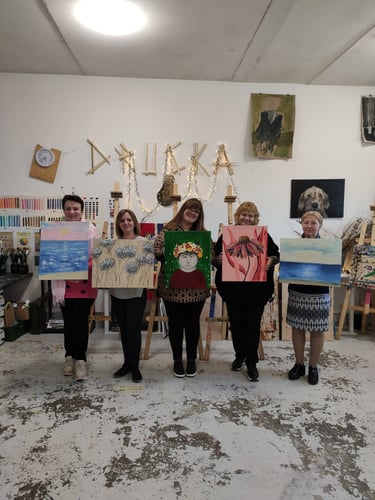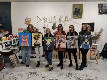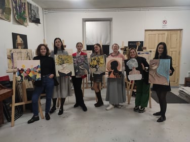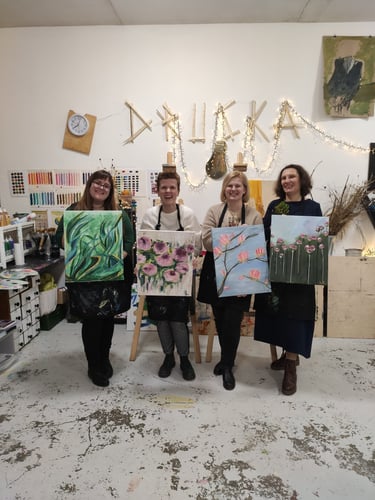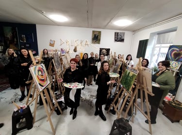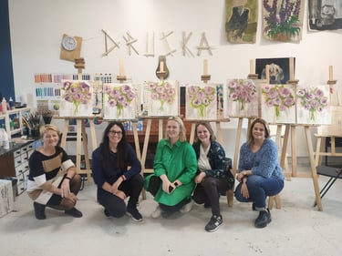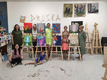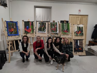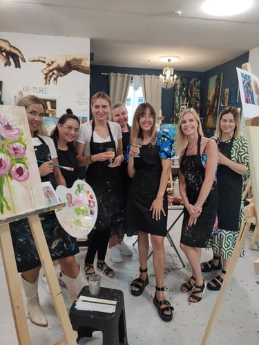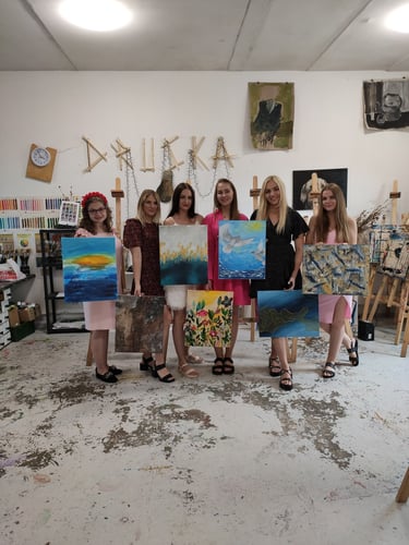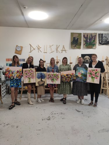 -Visos priemonės į kainą įskaičiuotos (prof. akriliniai dažai, teptukai, paletės, prijuostės ir t.t. Tapome ant 40x50cm drobių)