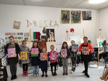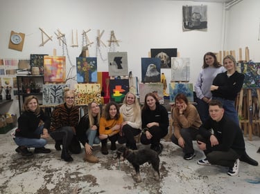 Priemonės: Visas priemones suteikia studija (prof. akriliniai dažai, teptukai, paletės, prijuostės ir t.t. Dalyviams suteikiame 40x50cm drobes. Norint kito formato drobės, informuokite).