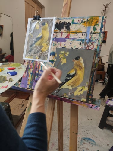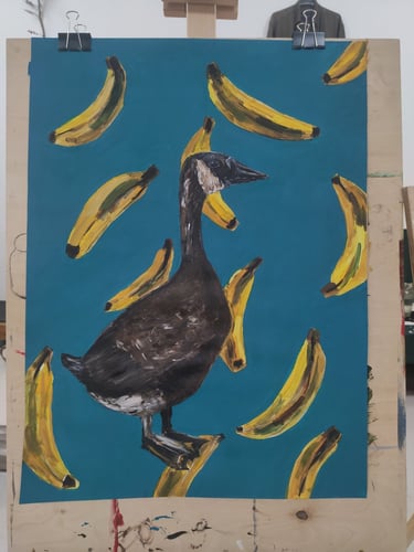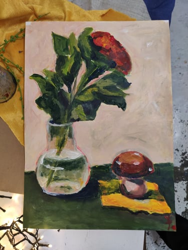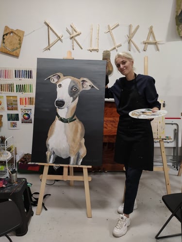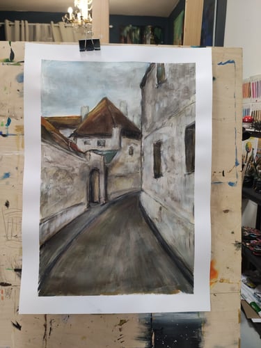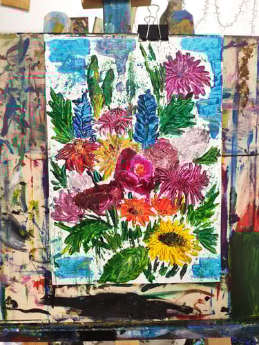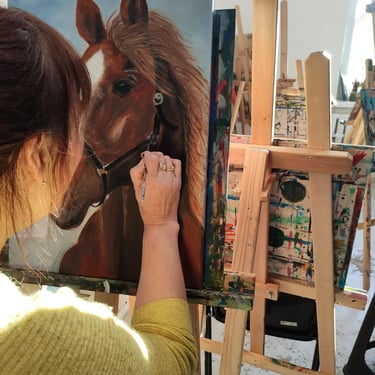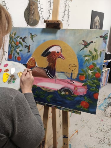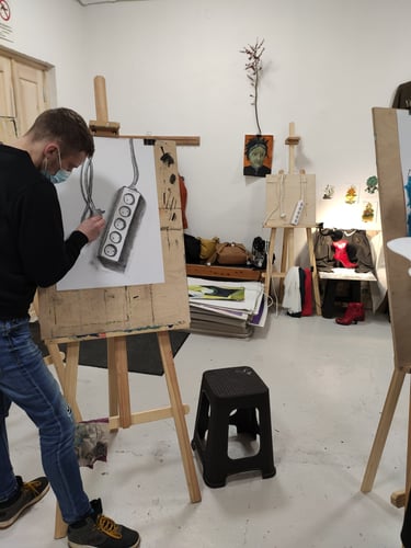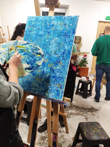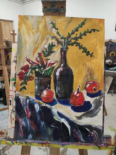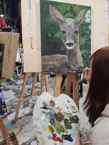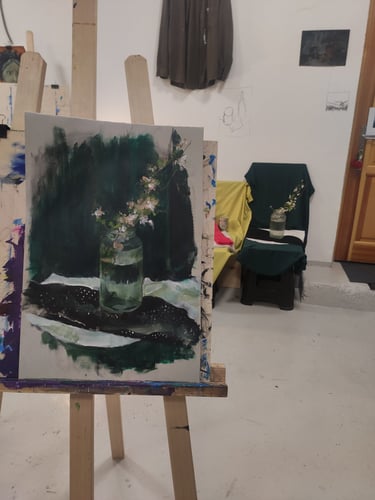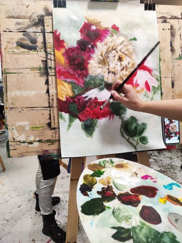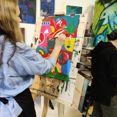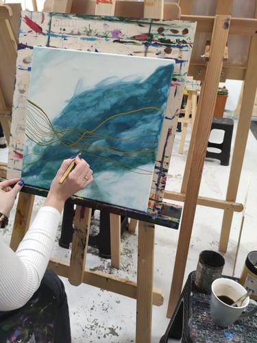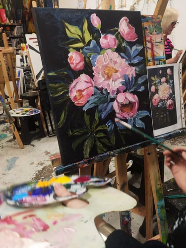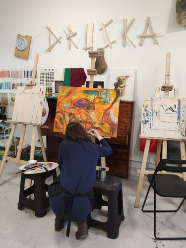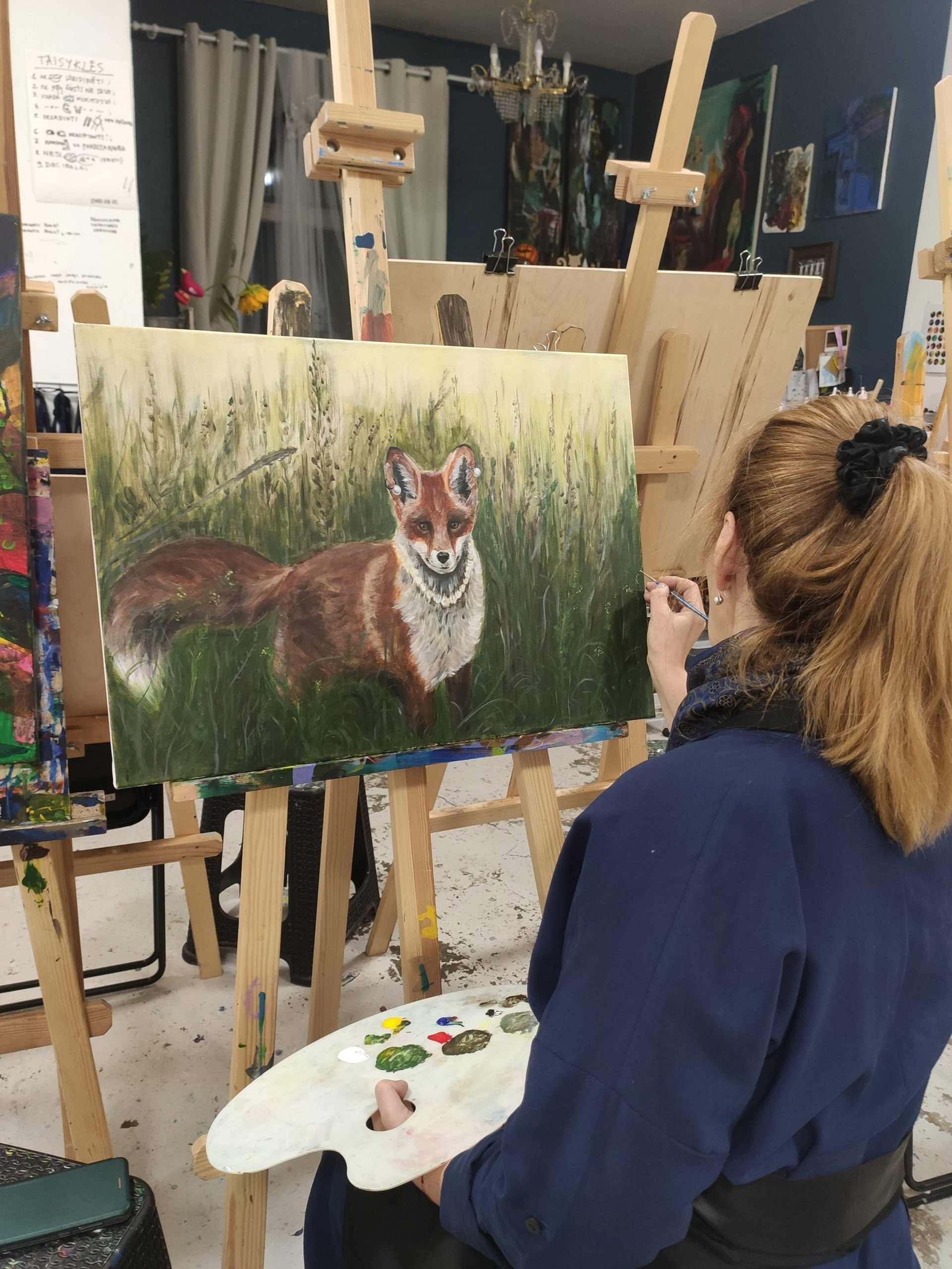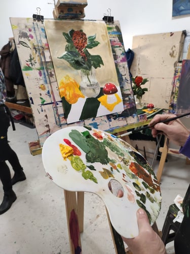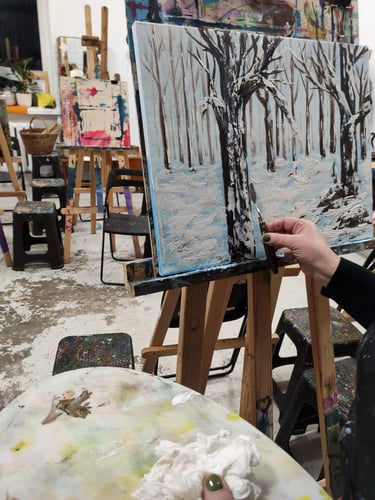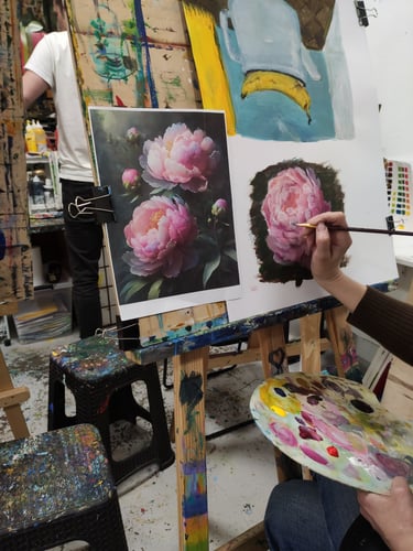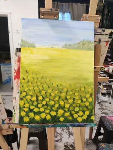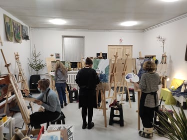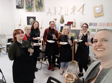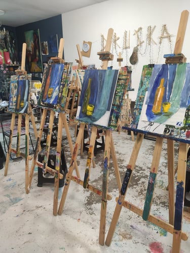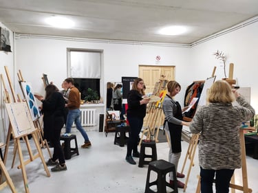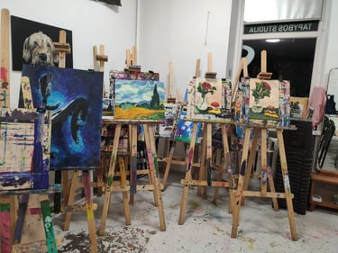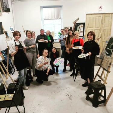 -Renkantis užsiėmimus su priemonėmis, į kainą įskaičiuoti prof. akriliniai dažai, teptukai, paletės, prijuostės ir t.t. Tapome ant popieriaus (drobę galima atsinešti savo arba įsigyti studijoje (3 - 15€).