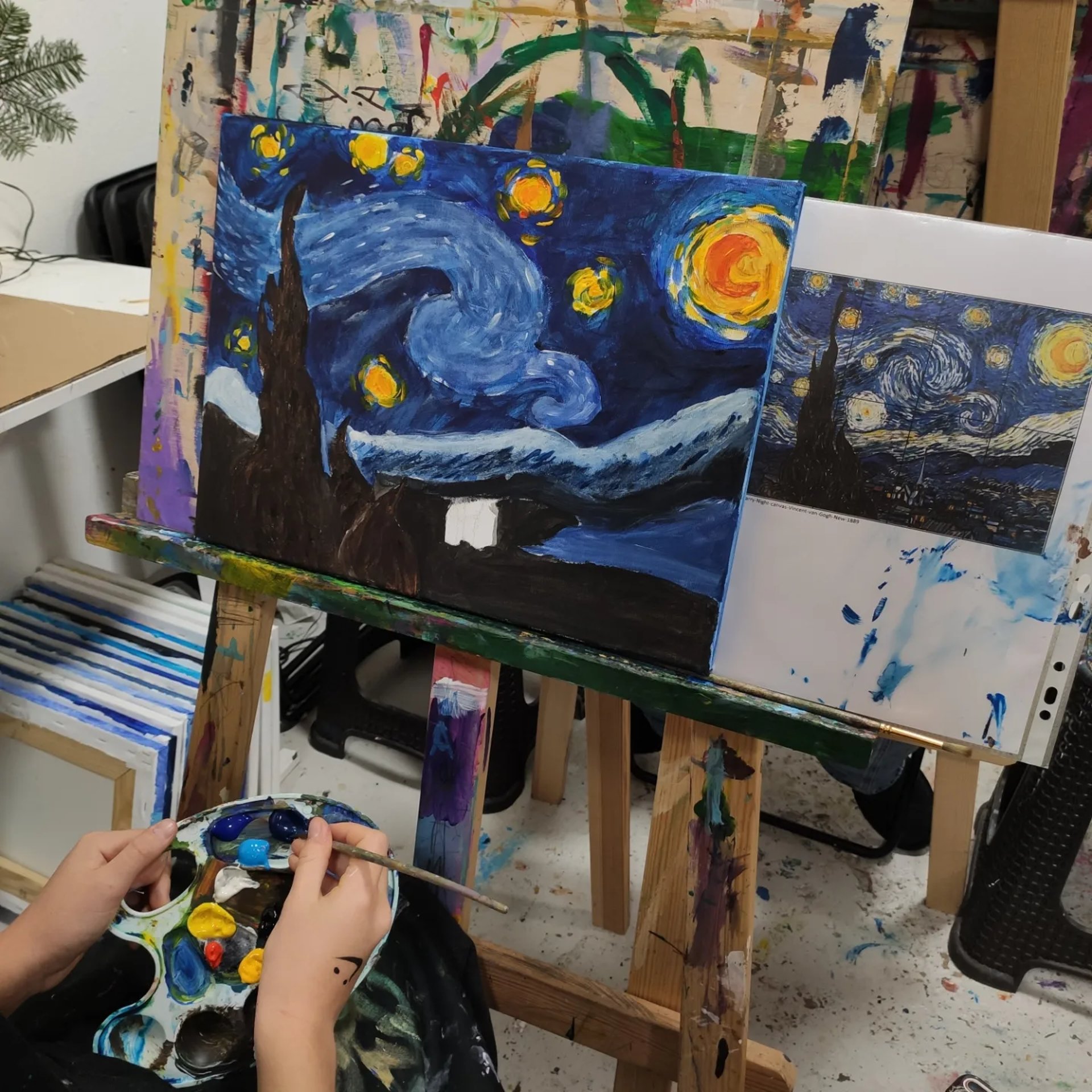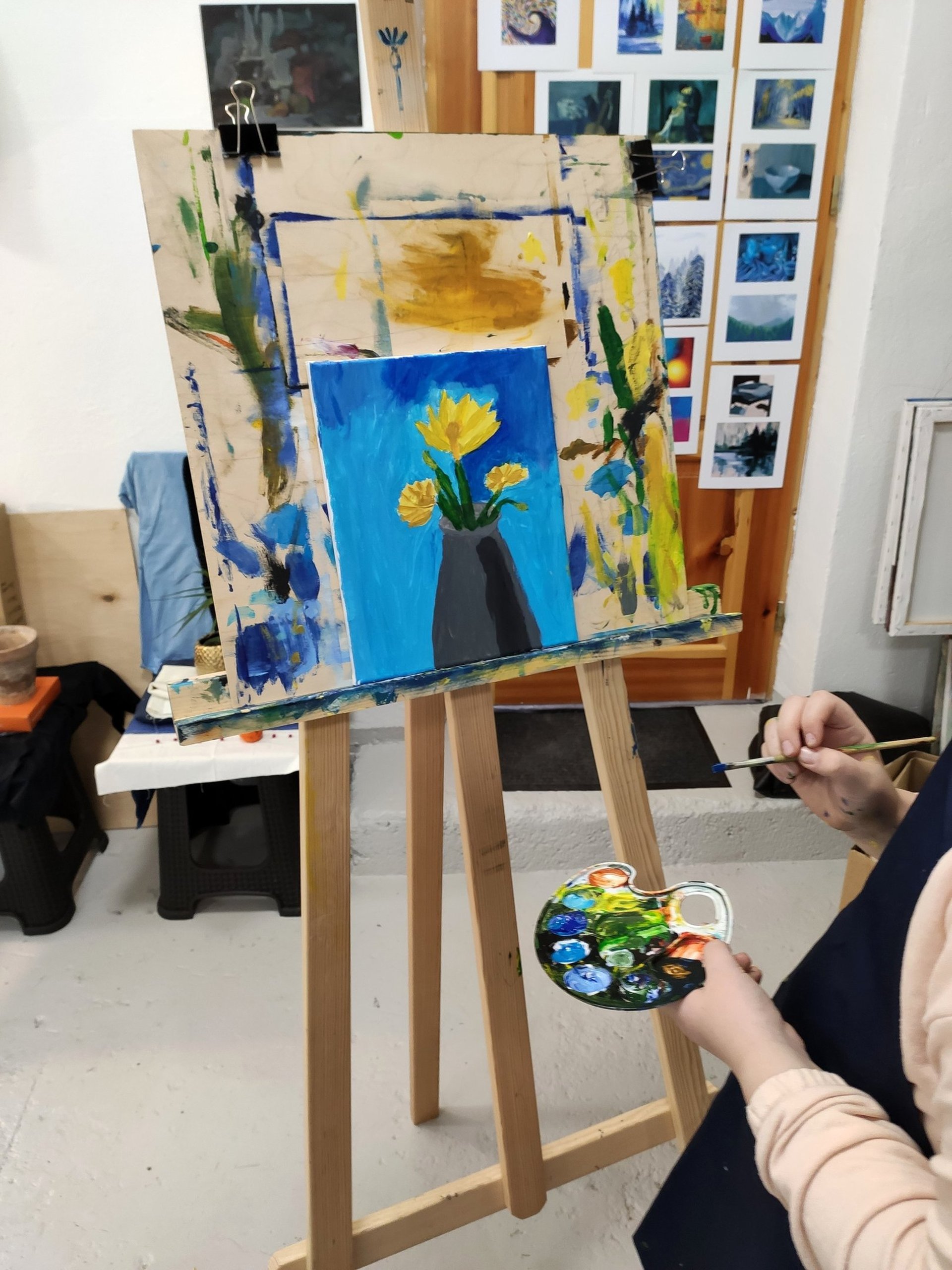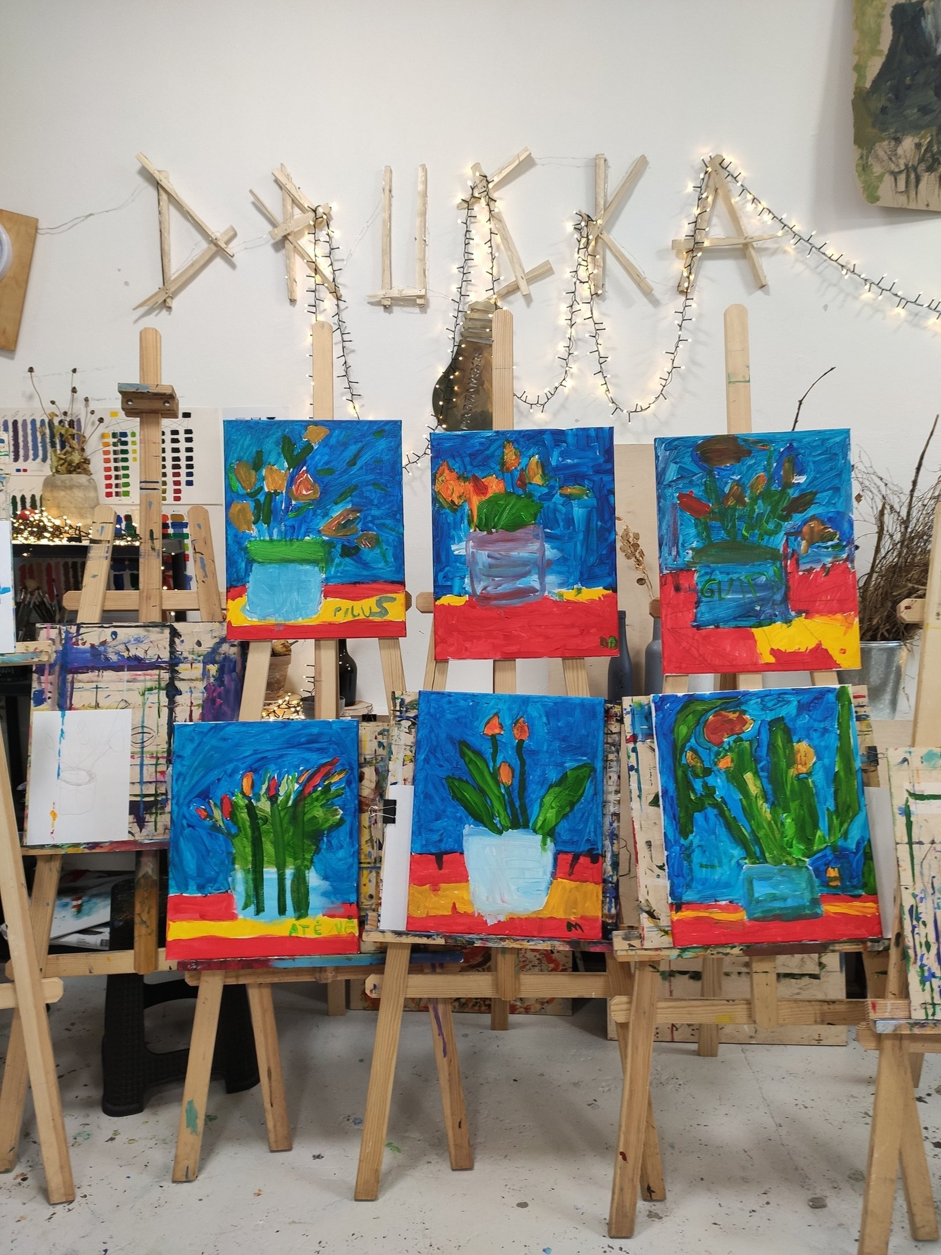 -Visos priemonės į kainą įskaičiuotos (prof. akriliniai dažai, teptukai, paletės, prijuostės ir t.t. Mėnesiui skiriama viena drobė)